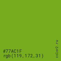 Цвет #77AC1F в цветовой модели RGB обозначается тремя октетами (119, 172, 31) в десятичном формате и #77AC1F в шестнадцатиричном (hex) формате, которые являются интенсивностью красного 119 (hex 77), интенсивность зелёного 172 (hex AC) и интенсивность синего 31 (hex 1F).