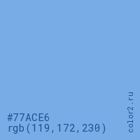 Цвет #77ACE6 в цветовой модели RGB обозначается тремя октетами (119, 172, 230) в десятичном формате и #77ACE6 в шестнадцатиричном (hex) формате, которые являются интенсивностью красного 119 (hex 77), интенсивность зелёного 172 (hex AC) и интенсивность синего 230 (hex E6).