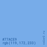 Цвет #77ACE9 в цветовой модели RGB обозначается тремя октетами (119, 172, 233) в десятичном формате и #77ACE9 в шестнадцатиричном (hex) формате, которые являются интенсивностью красного 119 (hex 77), интенсивность зелёного 172 (hex AC) и интенсивность синего 233 (hex E9).