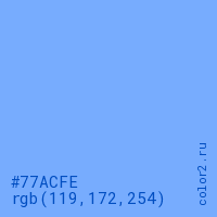 Цвет #77ACFE в цветовой модели RGB обозначается тремя октетами (119, 172, 254) в десятичном формате и #77ACFE в шестнадцатиричном (hex) формате, которые являются интенсивностью красного 119 (hex 77), интенсивность зелёного 172 (hex AC) и интенсивность синего 254 (hex FE).
