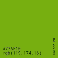 Цвет #77AE10 в цветовой модели RGB обозначается тремя октетами (119, 174, 16) в десятичном формате и #77AE10 в шестнадцатиричном (hex) формате, которые являются интенсивностью красного 119 (hex 77), интенсивность зелёного 174 (hex AE) и интенсивность синего 16 (hex 10).