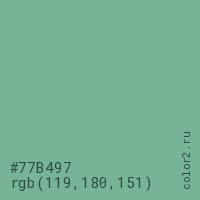 Цвет #77B497 в цветовой модели RGB обозначается тремя октетами (119, 180, 151) в десятичном формате и #77B497 в шестнадцатиричном (hex) формате, которые являются интенсивностью красного 119 (hex 77), интенсивность зелёного 180 (hex B4) и интенсивность синего 151 (hex 97).