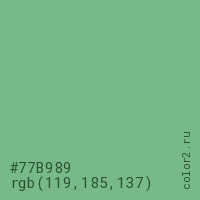 Цвет #77B989 в цветовой модели RGB обозначается тремя октетами (119, 185, 137) в десятичном формате и #77B989 в шестнадцатиричном (hex) формате, которые являются интенсивностью красного 119 (hex 77), интенсивность зелёного 185 (hex B9) и интенсивность синего 137 (hex 89).