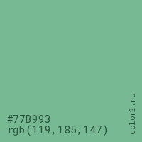 Цвет #77B993 в цветовой модели RGB обозначается тремя октетами (119, 185, 147) в десятичном формате и #77B993 в шестнадцатиричном (hex) формате, которые являются интенсивностью красного 119 (hex 77), интенсивность зелёного 185 (hex B9) и интенсивность синего 147 (hex 93).