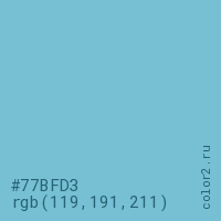 Цвет #77BFD3 в цветовой модели RGB обозначается тремя октетами (119, 191, 211) в десятичном формате и #77BFD3 в шестнадцатиричном (hex) формате, которые являются интенсивностью красного 119 (hex 77), интенсивность зелёного 191 (hex BF) и интенсивность синего 211 (hex D3).