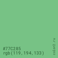 Цвет #77C285 в цветовой модели RGB обозначается тремя октетами (119, 194, 133) в десятичном формате и #77C285 в шестнадцатиричном (hex) формате, которые являются интенсивностью красного 119 (hex 77), интенсивность зелёного 194 (hex C2) и интенсивность синего 133 (hex 85).