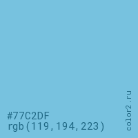 Цвет #77C2DF в цветовой модели RGB обозначается тремя октетами (119, 194, 223) в десятичном формате и #77C2DF в шестнадцатиричном (hex) формате, которые являются интенсивностью красного 119 (hex 77), интенсивность зелёного 194 (hex C2) и интенсивность синего 223 (hex DF).