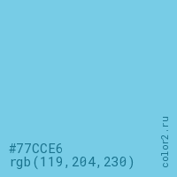 Цвет #77CCE6 в цветовой модели RGB обозначается тремя октетами (119, 204, 230) в десятичном формате и #77CCE6 в шестнадцатиричном (hex) формате, которые являются интенсивностью красного 119 (hex 77), интенсивность зелёного 204 (hex CC) и интенсивность синего 230 (hex E6).