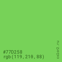 Цвет #77D258 в цветовой модели RGB обозначается тремя октетами (119, 210, 88) в десятичном формате и #77D258 в шестнадцатиричном (hex) формате, которые являются интенсивностью красного 119 (hex 77), интенсивность зелёного 210 (hex D2) и интенсивность синего 88 (hex 58).