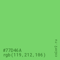 Цвет RGB(119, 212, 106) в процентом отношении количества цвета состоит из 46.7% красного (red), 83.1% зелёного (green) и 41.6% синего (blue).