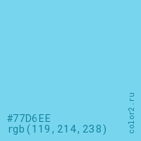 Цвет #77D6EE в цветовой модели RGB обозначается тремя октетами (119, 214, 238) в десятичном формате и #77D6EE в шестнадцатиричном (hex) формате, которые являются интенсивностью красного 119 (hex 77), интенсивность зелёного 214 (hex D6) и интенсивность синего 238 (hex EE).