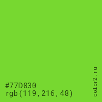 Цвет #77D830 в цветовой модели RGB обозначается тремя октетами (119, 216, 48) в десятичном формате и #77D830 в шестнадцатиричном (hex) формате, которые являются интенсивностью красного 119 (hex 77), интенсивность зелёного 216 (hex D8) и интенсивность синего 48 (hex 30).