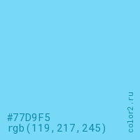 Цвет #77D9F5 в цветовой модели RGB обозначается тремя октетами (119, 217, 245) в десятичном формате и #77D9F5 в шестнадцатиричном (hex) формате, которые являются интенсивностью красного 119 (hex 77), интенсивность зелёного 217 (hex D9) и интенсивность синего 245 (hex F5).