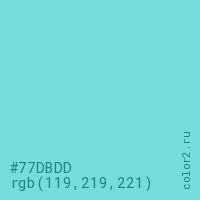 Цвет #77DBDD в цветовой модели RGB обозначается тремя октетами (119, 219, 221) в десятичном формате и #77DBDD в шестнадцатиричном (hex) формате, которые являются интенсивностью красного 119 (hex 77), интенсивность зелёного 219 (hex DB) и интенсивность синего 221 (hex DD).