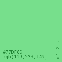 Цвет #77DF8C в цветовой модели RGB обозначается тремя октетами (119, 223, 140) в десятичном формате и #77DF8C в шестнадцатиричном (hex) формате, которые являются интенсивностью красного 119 (hex 77), интенсивность зелёного 223 (hex DF) и интенсивность синего 140 (hex 8C).