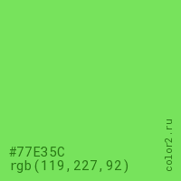Цвет #77E35C в цветовой модели RGB обозначается тремя октетами (119, 227, 92) в десятичном формате и #77E35C в шестнадцатиричном (hex) формате, которые являются интенсивностью красного 119 (hex 77), интенсивность зелёного 227 (hex E3) и интенсивность синего 92 (hex 5C).