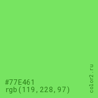Цвет #77E461 в цветовой модели RGB обозначается тремя октетами (119, 228, 97) в десятичном формате и #77E461 в шестнадцатиричном (hex) формате, которые являются интенсивностью красного 119 (hex 77), интенсивность зелёного 228 (hex E4) и интенсивность синего 97 (hex 61).