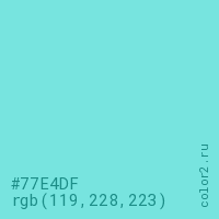 Цвет #77E4DF в цветовой модели RGB обозначается тремя октетами (119, 228, 223) в десятичном формате и #77E4DF в шестнадцатиричном (hex) формате, которые являются интенсивностью красного 119 (hex 77), интенсивность зелёного 228 (hex E4) и интенсивность синего 223 (hex DF).