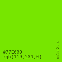 Цвет #77E600 в цветовой модели RGB обозначается тремя октетами (119, 230, 0) в десятичном формате и #77E600 в шестнадцатиричном (hex) формате, которые являются интенсивностью красного 119 (hex 77), интенсивность зелёного 230 (hex E6) и интенсивность синего 0 (hex 00).