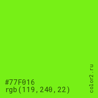 Цвет #77F016 в цветовой модели RGB обозначается тремя октетами (119, 240, 22) в десятичном формате и #77F016 в шестнадцатиричном (hex) формате, которые являются интенсивностью красного 119 (hex 77), интенсивность зелёного 240 (hex F0) и интенсивность синего 22 (hex 16).