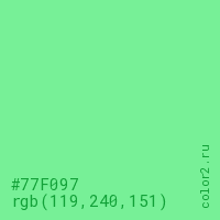Цвет #77F097 в цветовой модели RGB обозначается тремя октетами (119, 240, 151) в десятичном формате и #77F097 в шестнадцатиричном (hex) формате, которые являются интенсивностью красного 119 (hex 77), интенсивность зелёного 240 (hex F0) и интенсивность синего 151 (hex 97).