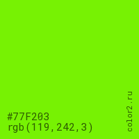Цвет #77F203 в цветовой модели RGB обозначается тремя октетами (119, 242, 3) в десятичном формате и #77F203 в шестнадцатиричном (hex) формате, которые являются интенсивностью красного 119 (hex 77), интенсивность зелёного 242 (hex F2) и интенсивность синего 3 (hex 03).