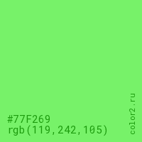 Цвет #77F269 в цветовой модели RGB обозначается тремя октетами (119, 242, 105) в десятичном формате и #77F269 в шестнадцатиричном (hex) формате, которые являются интенсивностью красного 119 (hex 77), интенсивность зелёного 242 (hex F2) и интенсивность синего 105 (hex 69).