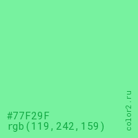 Цвет #77F29F в цветовой модели RGB обозначается тремя октетами (119, 242, 159) в десятичном формате и #77F29F в шестнадцатиричном (hex) формате, которые являются интенсивностью красного 119 (hex 77), интенсивность зелёного 242 (hex F2) и интенсивность синего 159 (hex 9F).