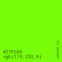 Цвет #77FC09 в цветовой модели RGB обозначается тремя октетами (119, 252, 9) в десятичном формате и #77FC09 в шестнадцатиричном (hex) формате, которые являются интенсивностью красного 119 (hex 77), интенсивность зелёного 252 (hex FC) и интенсивность синего 9 (hex 09).