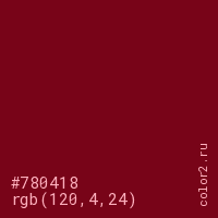 Цвет #780418 в цветовой модели RGB обозначается тремя октетами (120, 4, 24) в десятичном формате и #780418 в шестнадцатиричном (hex) формате, которые являются интенсивностью красного 120 (hex 78), интенсивность зелёного 4 (hex 04) и интенсивность синего 24 (hex 18).