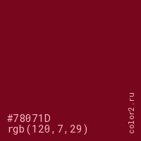 Цвет #78071D в цветовой модели RGB обозначается тремя октетами (120, 7, 29) в десятичном формате и #78071D в шестнадцатиричном (hex) формате, которые являются интенсивностью красного 120 (hex 78), интенсивность зелёного 7 (hex 07) и интенсивность синего 29 (hex 1D).