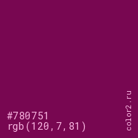 Цвет #780751 в цветовой модели RGB обозначается тремя октетами (120, 7, 81) в десятичном формате и #780751 в шестнадцатиричном (hex) формате, которые являются интенсивностью красного 120 (hex 78), интенсивность зелёного 7 (hex 07) и интенсивность синего 81 (hex 51).