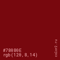Цвет #78080E в цветовой модели RGB обозначается тремя октетами (120, 8, 14) в десятичном формате и #78080E в шестнадцатиричном (hex) формате, которые являются интенсивностью красного 120 (hex 78), интенсивность зелёного 8 (hex 08) и интенсивность синего 14 (hex 0E).