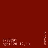 Цвет #780C01 в цветовой модели RGB обозначается тремя октетами (120, 12, 1) в десятичном формате и #780C01 в шестнадцатиричном (hex) формате, которые являются интенсивностью красного 120 (hex 78), интенсивность зелёного 12 (hex 0C) и интенсивность синего 1 (hex 01).