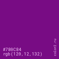 Цвет #780C84 в цветовой модели RGB обозначается тремя октетами (120, 12, 132) в десятичном формате и #780C84 в шестнадцатиричном (hex) формате, которые являются интенсивностью красного 120 (hex 78), интенсивность зелёного 12 (hex 0C) и интенсивность синего 132 (hex 84).