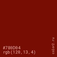 Цвет #780D04 в цветовой модели RGB обозначается тремя октетами (120, 13, 4) в десятичном формате и #780D04 в шестнадцатиричном (hex) формате, которые являются интенсивностью красного 120 (hex 78), интенсивность зелёного 13 (hex 0D) и интенсивность синего 4 (hex 04).
