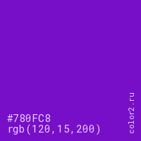 Цвет #780FC8 в цветовой модели RGB обозначается тремя октетами (120, 15, 200) в десятичном формате и #780FC8 в шестнадцатиричном (hex) формате, которые являются интенсивностью красного 120 (hex 78), интенсивность зелёного 15 (hex 0F) и интенсивность синего 200 (hex C8).