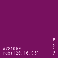 Цвет #78105F в цветовой модели RGB обозначается тремя октетами (120, 16, 95) в десятичном формате и #78105F в шестнадцатиричном (hex) формате, которые являются интенсивностью красного 120 (hex 78), интенсивность зелёного 16 (hex 10) и интенсивность синего 95 (hex 5F).