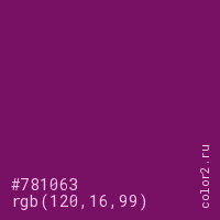 Цвет #781063 в цветовой модели RGB обозначается тремя октетами (120, 16, 99) в десятичном формате и #781063 в шестнадцатиричном (hex) формате, которые являются интенсивностью красного 120 (hex 78), интенсивность зелёного 16 (hex 10) и интенсивность синего 99 (hex 63).