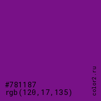 Цвет #781187 в цветовой модели RGB обозначается тремя октетами (120, 17, 135) в десятичном формате и #781187 в шестнадцатиричном (hex) формате, которые являются интенсивностью красного 120 (hex 78), интенсивность зелёного 17 (hex 11) и интенсивность синего 135 (hex 87).