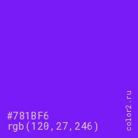 Цвет #781BF6 в цветовой модели RGB обозначается тремя октетами (120, 27, 246) в десятичном формате и #781BF6 в шестнадцатиричном (hex) формате, которые являются интенсивностью красного 120 (hex 78), интенсивность зелёного 27 (hex 1B) и интенсивность синего 246 (hex F6).