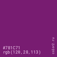 Цвет #781C71 в цветовой модели RGB обозначается тремя октетами (120, 28, 113) в десятичном формате и #781C71 в шестнадцатиричном (hex) формате, которые являются интенсивностью красного 120 (hex 78), интенсивность зелёного 28 (hex 1C) и интенсивность синего 113 (hex 71).