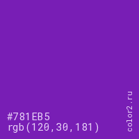 Цвет #781EB5 в цветовой модели RGB обозначается тремя октетами (120, 30, 181) в десятичном формате и #781EB5 в шестнадцатиричном (hex) формате, которые являются интенсивностью красного 120 (hex 78), интенсивность зелёного 30 (hex 1E) и интенсивность синего 181 (hex B5).