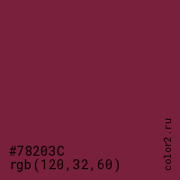 Цвет #78203C в цветовой модели RGB обозначается тремя октетами (120, 32, 60) в десятичном формате и #78203C в шестнадцатиричном (hex) формате, которые являются интенсивностью красного 120 (hex 78), интенсивность зелёного 32 (hex 20) и интенсивность синего 60 (hex 3C).