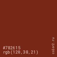 Цвет #782615 в цветовой модели RGB обозначается тремя октетами (120, 38, 21) в десятичном формате и #782615 в шестнадцатиричном (hex) формате, которые являются интенсивностью красного 120 (hex 78), интенсивность зелёного 38 (hex 26) и интенсивность синего 21 (hex 15).