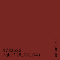 Цвет #782622 в цветовой модели RGB обозначается тремя октетами (120, 38, 34) в десятичном формате и #782622 в шестнадцатиричном (hex) формате, которые являются интенсивностью красного 120 (hex 78), интенсивность зелёного 38 (hex 26) и интенсивность синего 34 (hex 22).