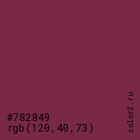 Цвет #782849 в цветовой модели RGB обозначается тремя октетами (120, 40, 73) в десятичном формате и #782849 в шестнадцатиричном (hex) формате, которые являются интенсивностью красного 120 (hex 78), интенсивность зелёного 40 (hex 28) и интенсивность синего 73 (hex 49).
