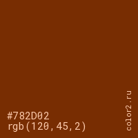 Цвет #782D02 в цветовой модели RGB обозначается тремя октетами (120, 45, 2) в десятичном формате и #782D02 в шестнадцатиричном (hex) формате, которые являются интенсивностью красного 120 (hex 78), интенсивность зелёного 45 (hex 2D) и интенсивность синего 2 (hex 02).
