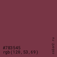 Цвет #783545 в цветовой модели RGB обозначается тремя октетами (120, 53, 69) в десятичном формате и #783545 в шестнадцатиричном (hex) формате, которые являются интенсивностью красного 120 (hex 78), интенсивность зелёного 53 (hex 35) и интенсивность синего 69 (hex 45).