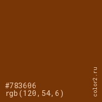 Цвет #783606 в цветовой модели RGB обозначается тремя октетами (120, 54, 6) в десятичном формате и #783606 в шестнадцатиричном (hex) формате, которые являются интенсивностью красного 120 (hex 78), интенсивность зелёного 54 (hex 36) и интенсивность синего 6 (hex 06).